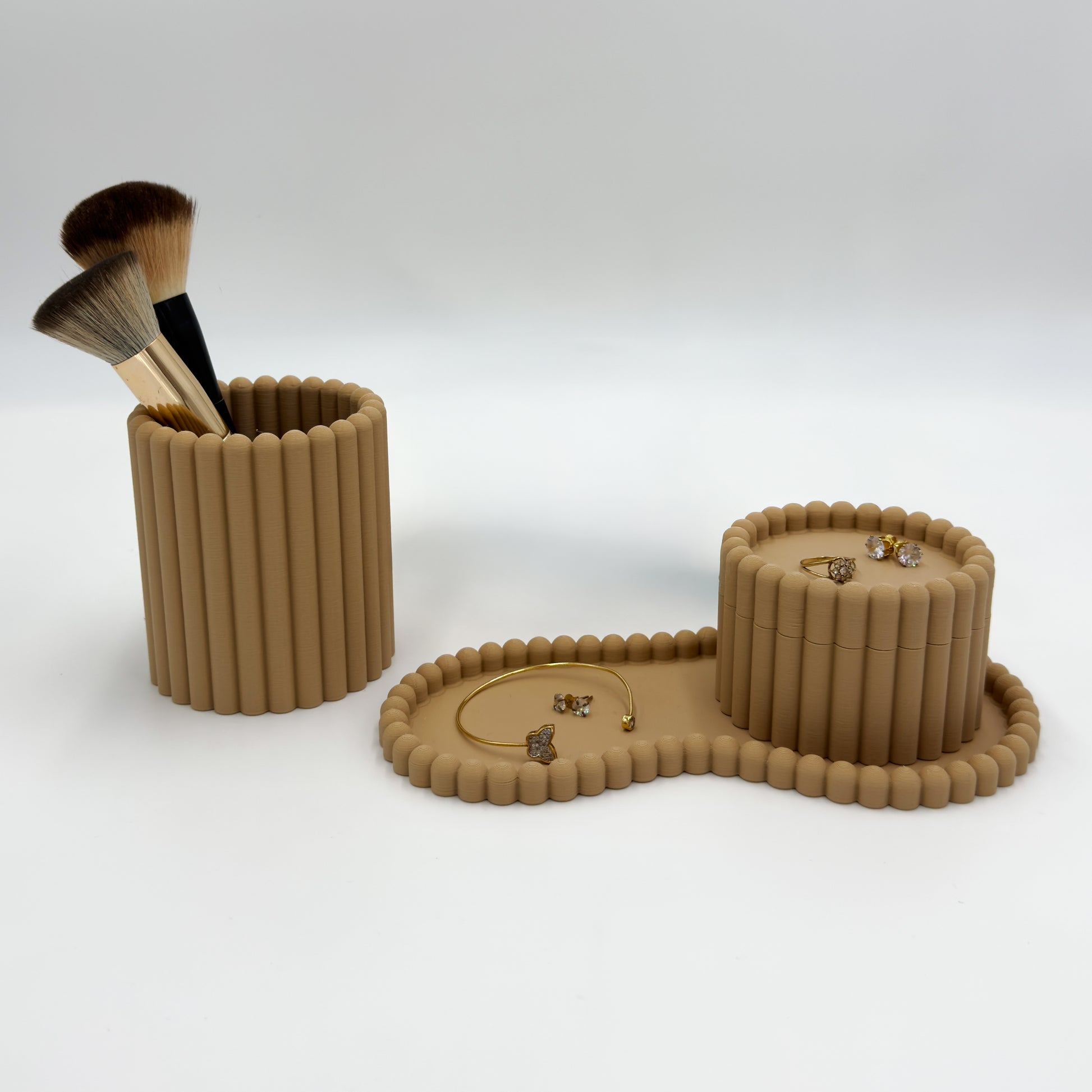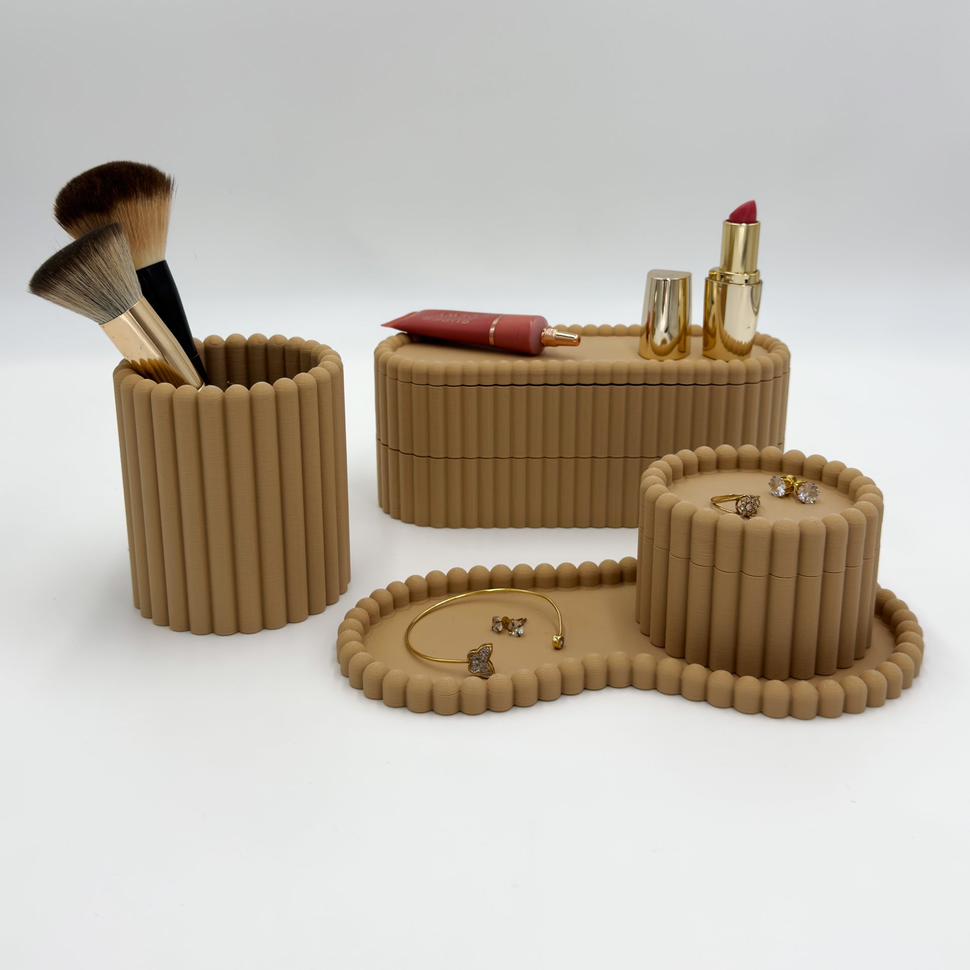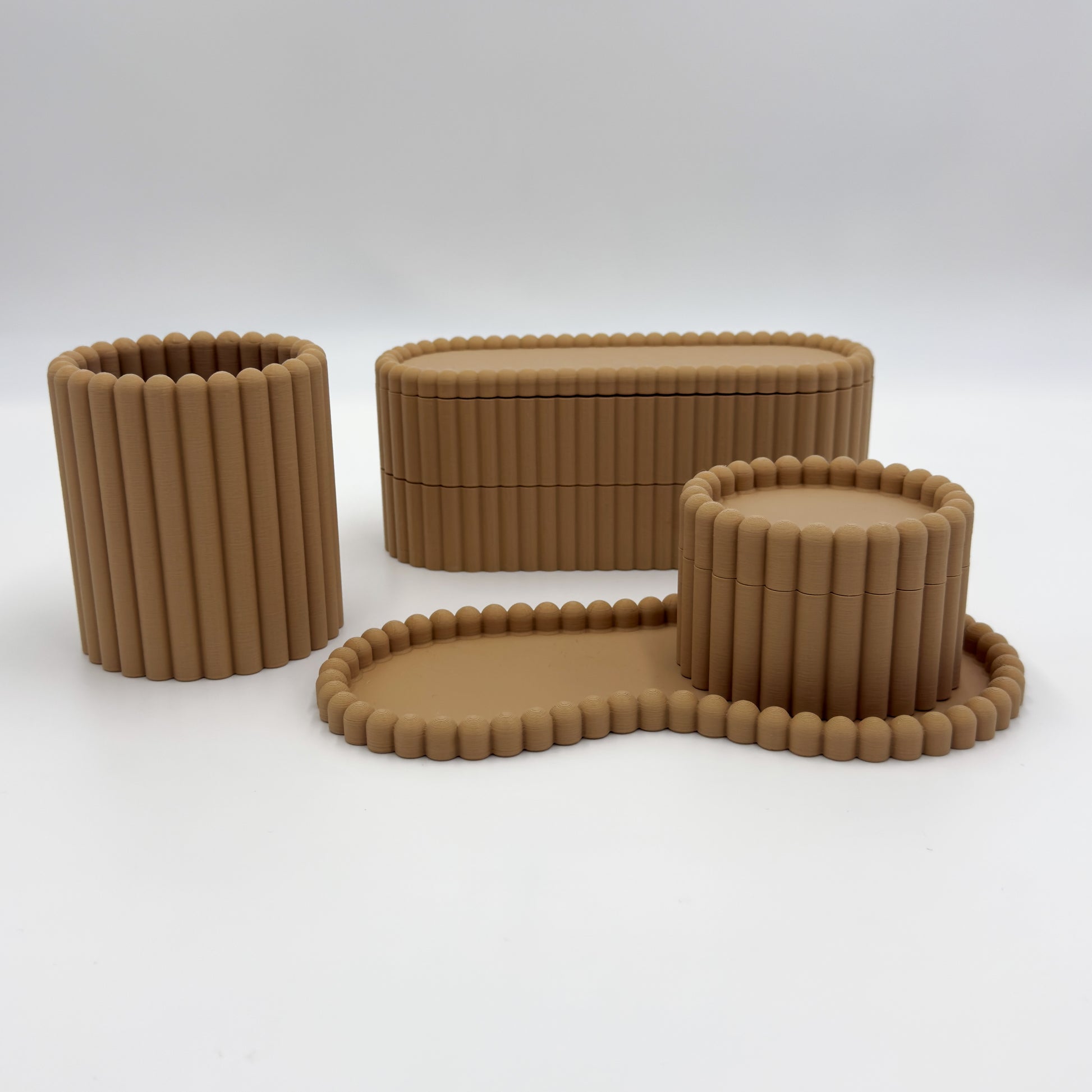 O kit inclui uma bandeja escultural, duas caixas funcionais e um copo versátil
